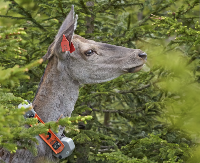 Abb. 6 – Besenderter Rothirsch im Untersuchungsgebiet mit oranger Ohrmarke. Foto: Markus P. Strähli