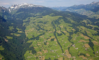 Abb. 2 - Typische Landschaft im Studiengebiet mit Streusiedlungen, intensiv bewirtschaftetem Grünland sowie Nadelwäldern - Grabser Berg. Foto: Markus P. Stähli,