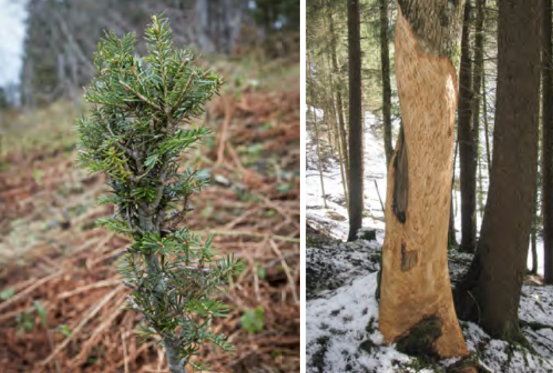 Abb. 4 und 5 - Schadbilder, entstanden durch die Nahrungsaufnahmeder Rothirsche, können örtlich deutliche Auswirkungen auf einzelne Bäume oder Baumbestände haben. Links: Verbissene Tanne, Rechts: geschälte Esche. Foto links: Markus P. Stähli, Foto rechts: Sascha Wellig.