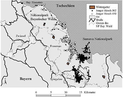 Mittels GPS und Mobilfunktechnik wurden im Nationalpark Bayerischer Wald die Wanderungsbewegungen des Rotwilds im Verlauf der Jahre bestimmt. Es zeigte sich, dass sich mit der Veränderung der Umweltbedingungen und dem Abbau des Grenzzauns zu Tschechien die Wanderungstätigkeit des Rotwildes stark verändert hat. Auch zwischen den Geschlechtern gibt es Unterschiede: Hirsche zeigen ein komplexeres Raumnutzungsverhalten als Kahlwild.