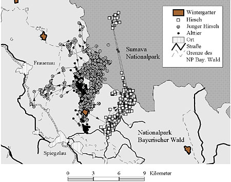 Die 2002 im Nationalpark telemetrierten Hirsche zeigen ein komplexeres und jahreszeitlich differenzierteres Raumnutzungsmuster als die Alttiere.