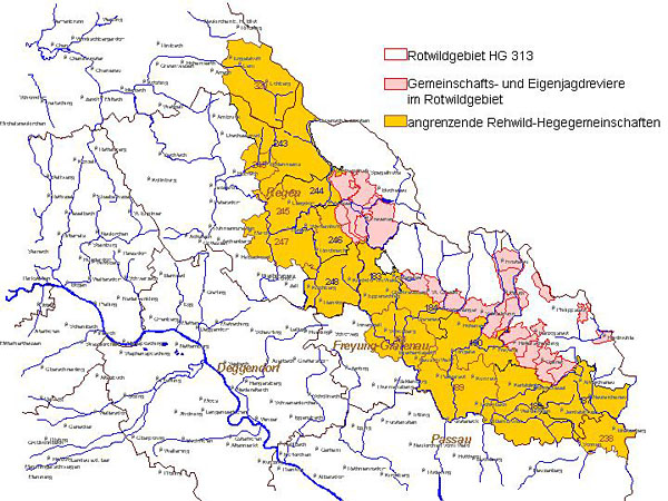 Bereits im Jahre 1968 wurde das "Rotwildgebiet Bayerischer Wald" per Rechtsverordnung ausgewiesen. Alle anderen Reviere wurden damals zur "rotwildfreien Zone" erklärt. In diesem Gebieten wird Rotwild nach derzeitiger Gesetzeslage nicht geduldet und muss im Rahmen der Jagdzeiten erlegt werden. Um Probleme mit der Land- und Forstwirtschaft vor allem in der vegetationsarmen Zeit zu vermeiden, wird ein Großteil des Rotwildes in sieben Gattern überwintert und wird dort auch gefüttert.