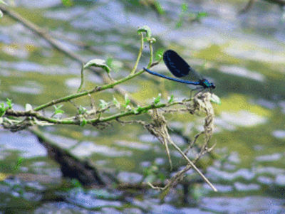 Abb. 12. Auch die Gebänderte Prachtlibelle bewohnt langsam fließende Bäche, kleinere Flüsse und krautreiche Kanäle. Verschmutzung, Kanalisierung, Begradigungen und Uferverbauungen von Fließgewässern haben ihre Lebensräume stark eingeschränkt. Foto: Doris Hölling