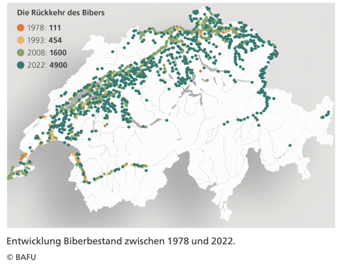 Die Wiederansiedlung des Bibers verlief zuerst recht schleppend - was aber laut Christof Angst von der Biberfachstelle normal ist. Seit Mitte der 1990er Jahre wuchs die Biber-Population stark an. 2008 gab es schweizweit etwa 1600 Tiere, verteilt auf 472 Reviere, die heute gut miteinander vernetzt waren. Während Biber 1993 lediglich rund 280 km Flusslauf permanent besiedelten, waren es 2008 bereits 1400 km. Zuerst lebten sie an den grossen Flüsse Aare, Rhein, Rhone und Thur, später besetzten sie auch die Seitengewässer im Kulturland, sofern diese keine Hindernisse wie Wehre, Staumauern oder Eindolungen aufwiesen.