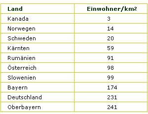 Tab. 1: Bevölkerungsdichte in Deutschland im Vergleich zu Ländern und Regionen mit Bärenpopulation