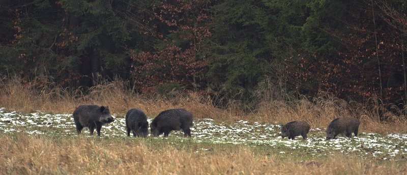 Abb. 1: Schwarzwildrotte auf einem Feld. Revierübergreifende Bewegungsjagden und Sammelansitze sind für die Bejagung des Schwarzwildes unerlässlich (Foto: P. Gilbert).