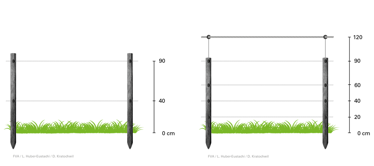 Abb. 4: Weidezaun mit zwei stromführenden Leitern auf 40 und 90 cm Höhe (links) und beispielhafte Aufrüstung eines Weidezaunes (rechts): stromführende Leiter auf 20-40-60-90-120 cm Höhe, zusätzliche mobile Streckenpfosten, vorhandene Eckpfosten werden mit Abstandsisolatoren eingesetzt. Quelle: FVA/L. Huber-Eustachi/D. Kratochwil.