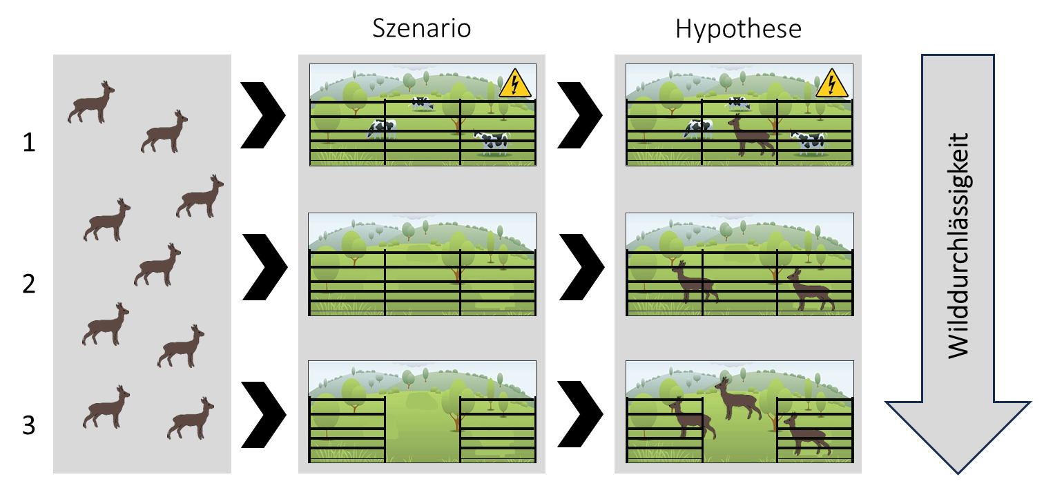 Abb. 6: Schemazeichnung der Szenarien und Hypothesen der zweiten Projektphase: Die Hypothesen gehen davon aus, dass die Wilddurchlässigkeit der Elekrofestzäune von Szenario eins bis drei ansteigen wird. Die Annahme war, dass das Abschalten des Stromes und das Öffnen der vorhanden Weidetore zu einer höheren Anzahl von Wildtieren auf den Weideflächen führt. Quelle: FVA