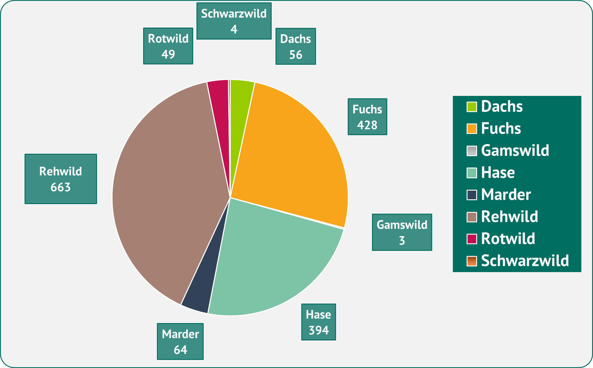 In der zweiten Projektphase wurden zahlreiche Wildarten auf den untersuchten Weideflächen nachgewiesen. Am häufigsten trat Rehwild auf, gefolgt von Fuchs und Feldhase. Dachse wurden regelmäßig dokumentiert, Schwarzwild hingegen nur vereinzelt.