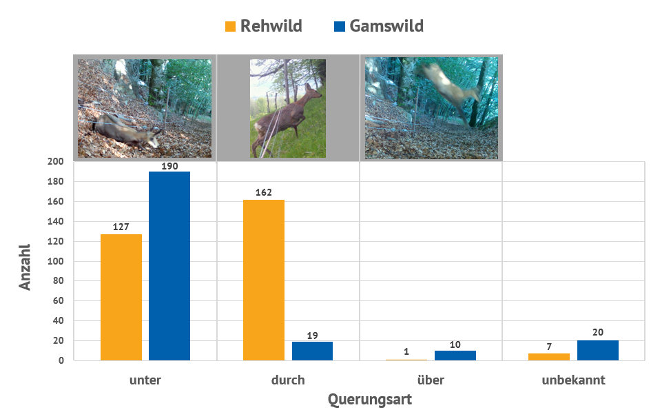Insgesamt wurden über 600 Annäherungen und Querungsversuche von Reh- und Gamswild dokumentiert. Beide Arten waren grundsätzlich in der Lage, sowohl herkömmliche und damit nicht wolfsabweisende, als auch wolfsabweisend gestaltete Zäune zu queren.