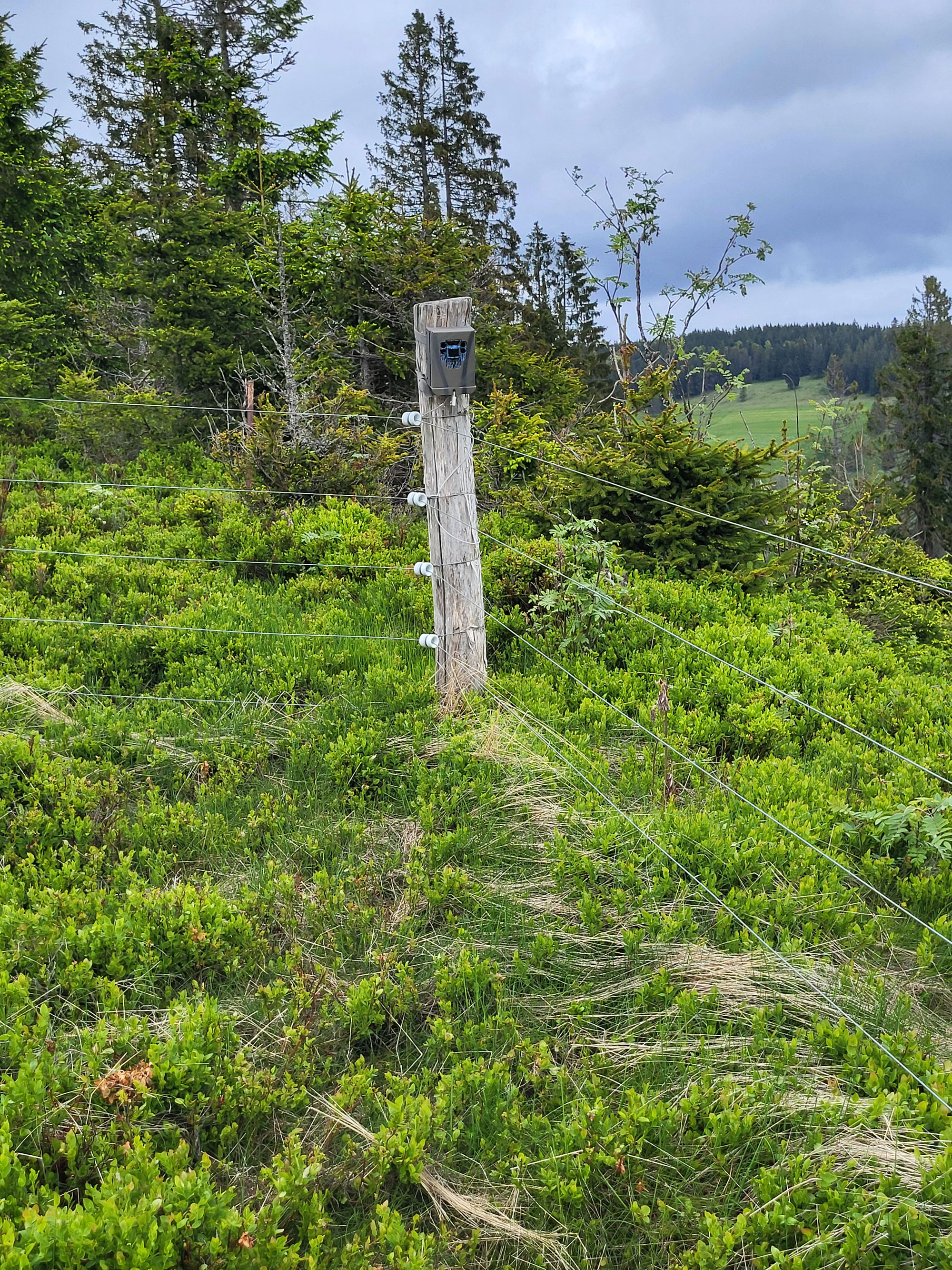 In der zweiten Projektphase (Januar 2023 bis Dezember 2024) wurden ausschließlich Weideflächen mit bereits wolfsabweisend gestalteten Elektrofestzäunen untersucht. Diese entsprachen dem empfohlenen Herdenschutz in Baden-Württemberg mit fünf Drahtleitern auf 20, 40, 60, 90, 120 cm Höhe.