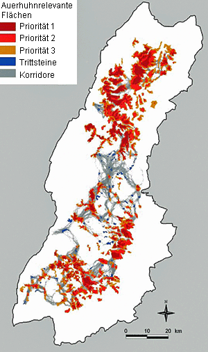 Die dargestellten Gegebenheiten von begrenzten und stark fragmentierten Waldflächen, die Notwendigkeiten eines Biotopverbunds und die Anforderungen an die Waldbewirtschaftung im Hinblick auf Biodiversität können am Aktionsplan Auerhuhn beispielgebend zusammengeführt werden. Die für eine überlebensfähige Population notwendigen Waldflächen und Verbundkorridore wurden aus der aktuellen Auerhuhnverbreitung, diversen Untersuchungen und landschaftsökologischen Bedingungen abgeleitet. Damit ist klar, wo etwas für diese Art getan werden kann oder muss. Wichtig ist auch, dass außerhalb der in Abb. 6 dargestellten Flächenkulisse das Auerhuhn nicht berücksichtigt werden muss.