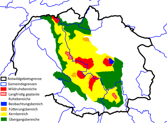 Wird dagegen die in Abb. 3 dargestellte Komplexität des mit Schälschäden zusammenhängenden Wirkungsgefüges betrachtet, wird einerseits die große Bedeutung der Wilddichte und Bejagung deutlich. Andererseits müssen aber auch je nach Einzelfallsituation zahlreiche andere Einflussfaktoren berücksichtigt werden. Die Verantwortlichkeiten erfordern auch hier ein gemeinsames Wildtiermanagement. Ein beispielgebendes Management wird seit 2008 im Rotwildgebiet Südschwarzwald realisiert. Die in Abb. 4 dargestellte Rotwildkonzeption gibt für jeden Verantwortungsbereich (Waldbau, Jagd, Tourismus, Naturschutz) und jede Gebietskategorie die umzusetzenden Maßnahmen vor.