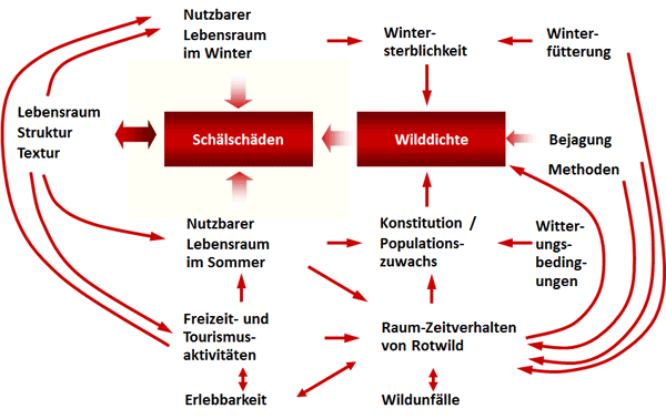 Abb. 3: Vereinfachtes Wirkungsgefüge Schälschäden und Rotwilddichte.