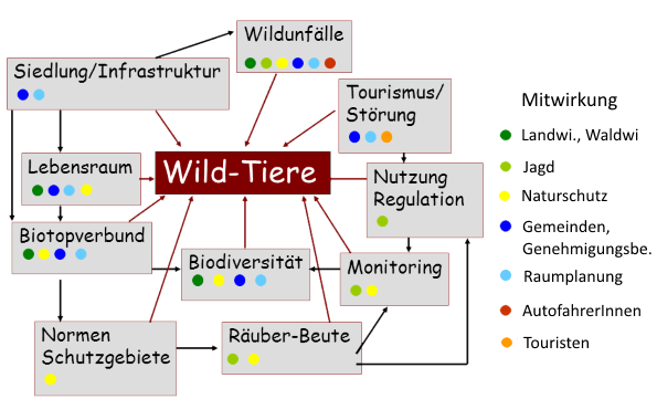 Allein an dieser Aufzählung wird deutlich, dass der Umgang mit Wildtieren zu einer gesellschaftlichen Aufgabe geworden ist, die nicht durch eine Interessengruppe allein bewältigt werden kann. Vielmehr ist eine Allianz von verschiedenen Akteurinnen und Akteuren notwendig, die gemeinsam die komplexen Herausforderungen beim Umgang mit Wildtieren meistern. Diese gemeinsamen Aktivitäten können unter dem Begriff "Wildtiermanagement" zusammengefasst werden.