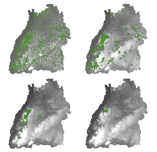 Abb. 1: Oben links: Die um mögliche Störeinflüsse reduzierte Waldflächen Baden-Württembergs (Waldränder 50m, Kreisstraßen 30m, Bundes-/Landesstraßen 40m, Bundesautobahnen 100m, Ortslagen 300m). Oben rechts: Davon die Waldfläche mit einer Größe von mehr als 1.000 Hektar; unten links: > 5.000 Hektar und unten rechts > 10.000 Hektar.