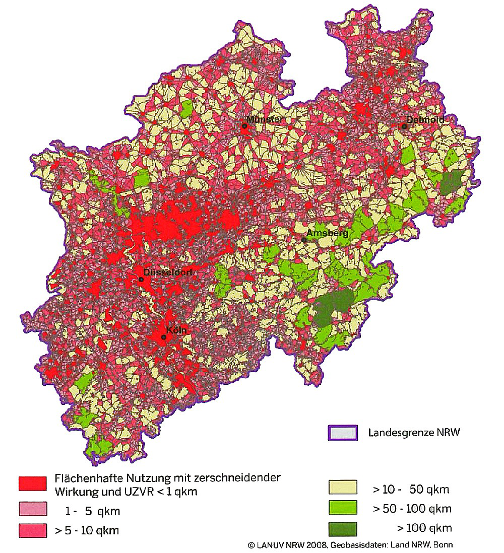 Eine Übersicht über die unzerschnittenen Räume und die Naturschutzgebiete macht die enge Verzahnung gerade in NRW deutlich (s. Abb. 2). Im Vordergrund steht der Ausgleich zwischen Natur und Mensch. Der Begriff Wildschaden ist stets aus der Sicht des wirtschaftenden Menschen formuliert und kennzeichnet gewissermaßen die Auswirkungen tierischen Verhaltens auf die Umwelt unter dem Gesichtspunkt wirtschaftlicher Schäden.