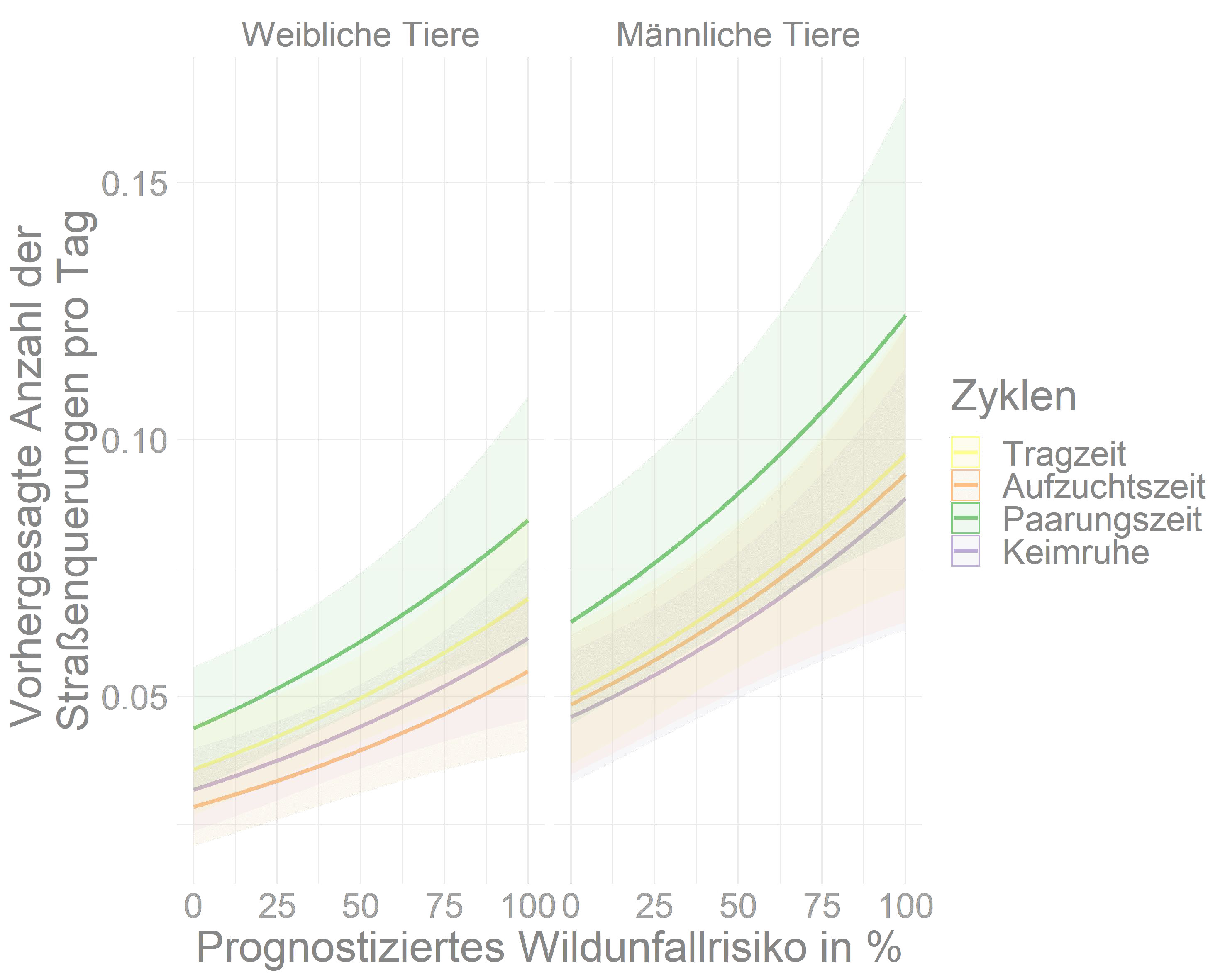 Wildunfälle sind Folgen einer komplexen Vermengung von räumlichen Lebensraum- und Infrastruktureigenschaften sowie menschlichem und tierischem Verhalten. Diese bestimmen das Vorkommen von Rehen, die Wahrscheinlichkeit einer Straßenüberquerung in einem bestimmten Abschnitt sowie das spezifische Unfallrisiko. Zudem beeinflussen unterschiedliche Verhaltensweisen im Jahresverlauf die zeitliche Verteilung von Wildunfällen. Die Ergebnisse der Studie legen eine lineare Beziehung zwischen Anzahl der Straßenüberquerungen und Kollisionen nahe. Jedoch scheinen Abschnitte mit hoher Überquerungsfrequenz weitaus stärker von individuellen Bewegungsverhalten abzuhängen als bisher angenommen. Das Wildunfallrisiko lässt sich somit nur eingeschränkt anhand von Unfalldaten vorhersagen. Verhaltensforschung und das Wissen über Einflussfaktoren ermöglichen ein besseres Verständnis für die Wirkung von Straßen auf Wildtiere und könnten in Zukunft wichtige ergänzende Bausteine in der Vermeidung von Verkehrsunfällen werden.