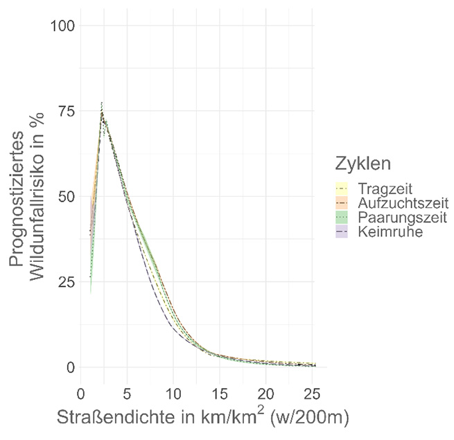 Die durchschnittliche Straßendichte in Deutschland liegt bei sechs Kilometern pro Quadratkilometer. Das höchste Wildunfallrisiko besteht indes bei einer Straßendichte von 2,2 km/km2 (Abbildung 4). Dieser Wert entspricht den Strukturen in der Nähe von Dörfern sowie an Stadträndern. Die Zahlen lassen vermuten, dass Rehe in Gebieten mit hoher Straßendichte und weitere menschlicher Infrastruktur seltener vorkommen und somit zahlenmäßig seltener die Fahrbahn überqueren als in dünner besiedelten Lebensräumen. Gebiete mit hoher Straßendichte ab 10 km/km2 weisen zusätzlich ein höheres tägliches Verkehrsaufkommen auf, was die Wachsamkeit und das Meideverhalten der Rehe steigern könnte.