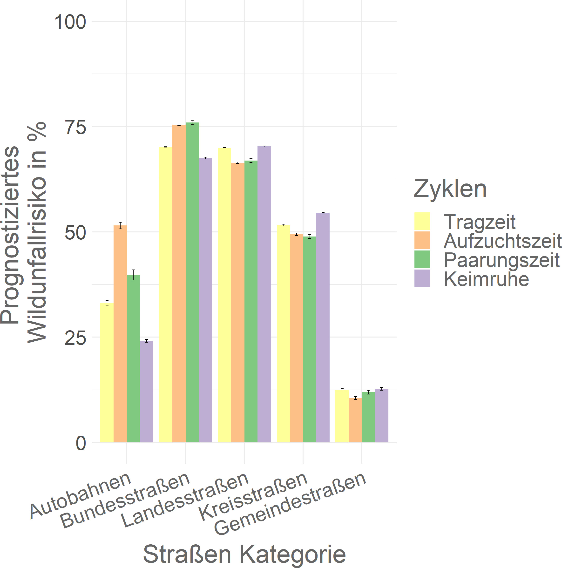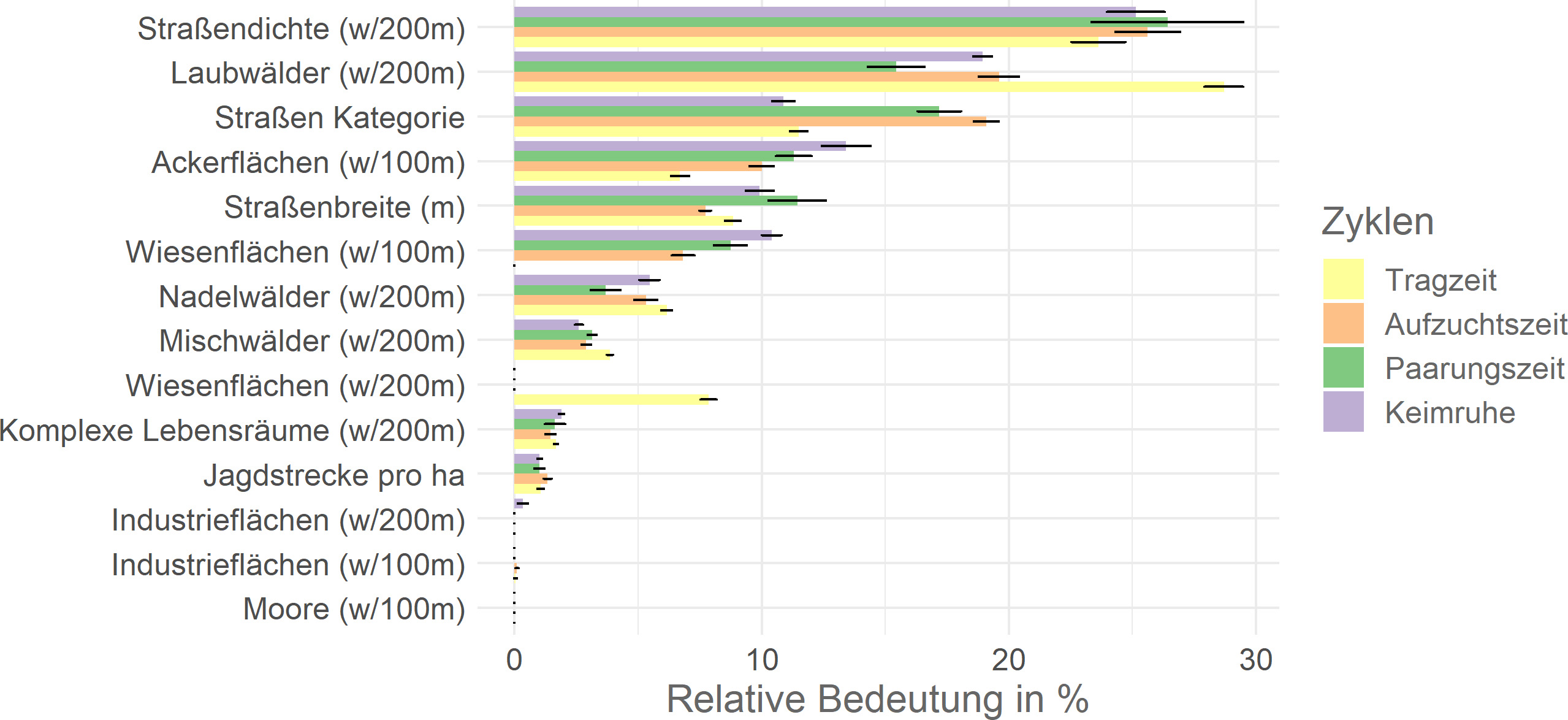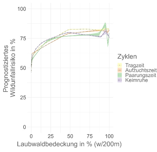 Während der Paarungszeit hat der Straßentyp den größten Einfluss auf das Wildunfallrisiko. Im restlichen Jahr sind Laubwälder und die Straßendichte die wichtigsten Faktoren für ein erhöhtes Wildunfallrisiko. Innerhalb der vier angeführten Zeiträume gab es gleichzeitig nur leichte Veränderungen bei den räumlich relevanten Einflussfaktoren (Abbildung 7).