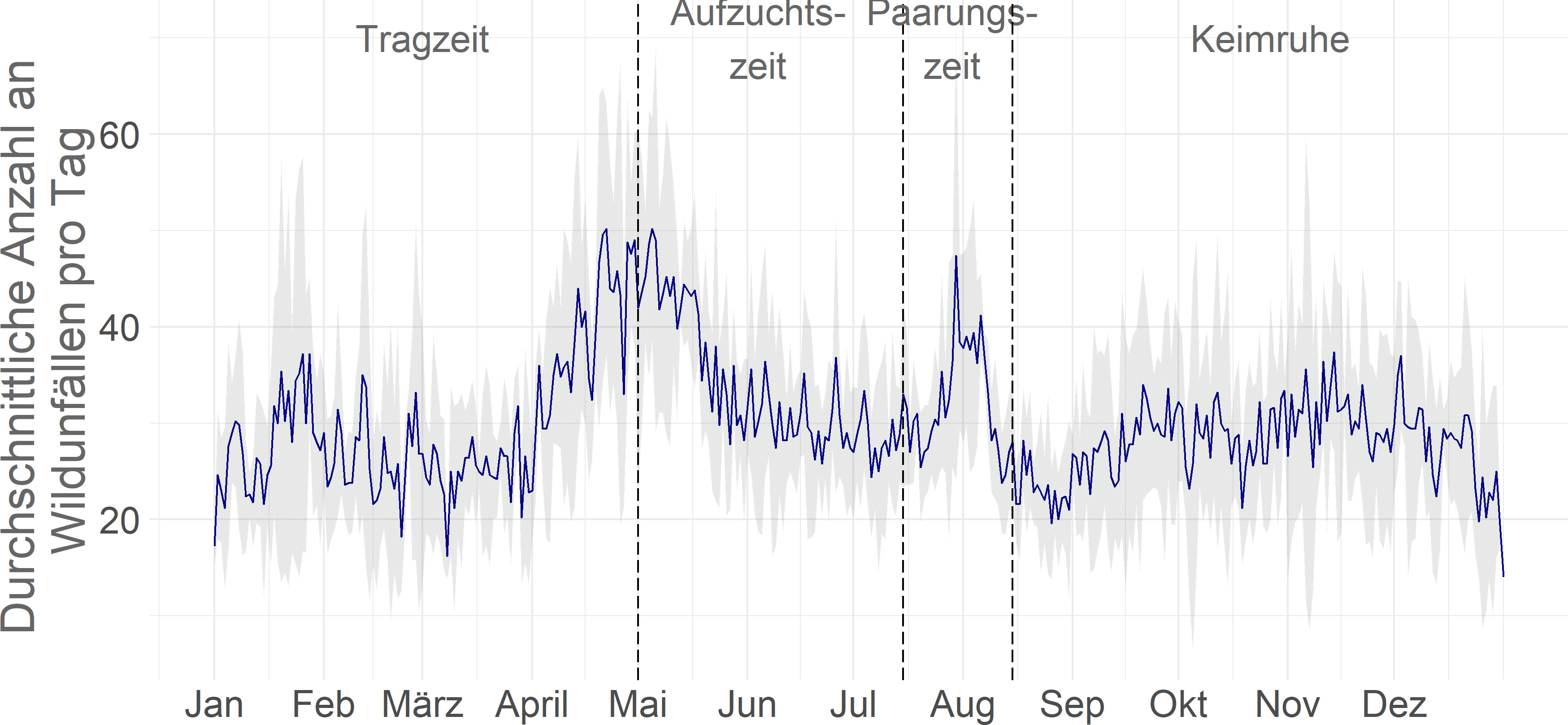 Im Jahresverlauf schwankt die Anzahl an Wildunfällen (Abbildung 6). Dieser Umstand ist vermutlich größtenteils auf saisonale Änderungen im Verhalten der Rehe zurückzuführen. Die analysierten Daten zeigen im April und Mai sowie zwischen Mitte Juli und Mitte August Unfallhöhepunkte. Während der Paarungszeit im Sommer kreuzen Rehe – Männchen und Weibchen in ähnlichem Umfang – die Straßen am häufigsten. Womöglich sind Rehe im Hormonrausch unvorsichtiger oder bemerken herannahende Fahrzeuge später. Der Grund für den Anstieg zum Ende der Tragzeit im April und Mai könnte in der Frühjahrsausbreitung liegen, wenn die Tiere nach der Winterzeit wieder auseinandergehen und sich neue Streifgebiete erschließen oder unerfahrene Jungtiere in unbekannte Gebiete wandern.