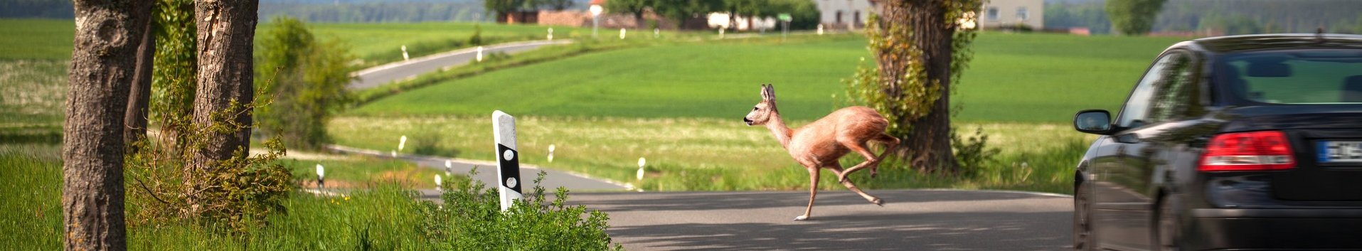 Bei einer Autofahrt passiert ein Zusammenstoß mit einem Wildtier. Wie verhalte ich mich richtig?