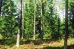 - Bei Nadeln von Koniferen beginnt die Chlorose an der Nadelspitze und breitet sich zur Nadelbasis hin aus. Die Vergilbung beginnt an den Nadeln der älteren Jahrgänge meist im mittleren Kronenbereich der Bäume (s. Abb. 4). Die Verfärbungssymptome treten vornehmlich an den Nadeln bzw. Zweigseiten auf, die direkt der Lichteinstrahlung ausgesetzt sind. Später werden die stark vergilbten Nadeln meist nekrotisch und fallen schließlich ab. In bestimmten Fällen ist aber auch ein natürliches Wiederergrünen vergilbter Nadeln möglich. Die jüngsten Triebe bleiben bei mäßigem Mangel grün (s. Abb. 5). Bei anhaltendem Mg-Mangel greift die Verfärbung jeweils auf den nächsten noch grünen Nadeljahrgang über, wenn die neuen Triebe im Frühjahr gebildet werden. Das Höhenwachstum mäßig vergilbter Fichten scheint nicht reduziert zu sein. Jahrringanalysen aber zeigen bei vergilbten Fichten einen im Vergleich zu symptomfreien Bäumen reduzierten Zuwachs.