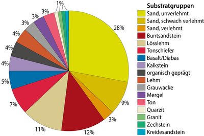 In Schleswig-Holstein, Niedersachsen und Sachsen-Anhalt überwiegen mit Abstand die Sande mit ihren verschiedenen Verlehmungsgraden. Im Hessischen Bergland sind Buntsandstein, Basalt oder Tonschiefer am häufigsten. Waldmoore befinden sich überwiegend in Niedersachsen, obwohl sie vereinzelt überall vorkommen können. Reichere Mergelstandorte sind typisch für den Osten Schleswig-Holsteins, Lösslehm dagegen in den anderen drei Bundesländern.