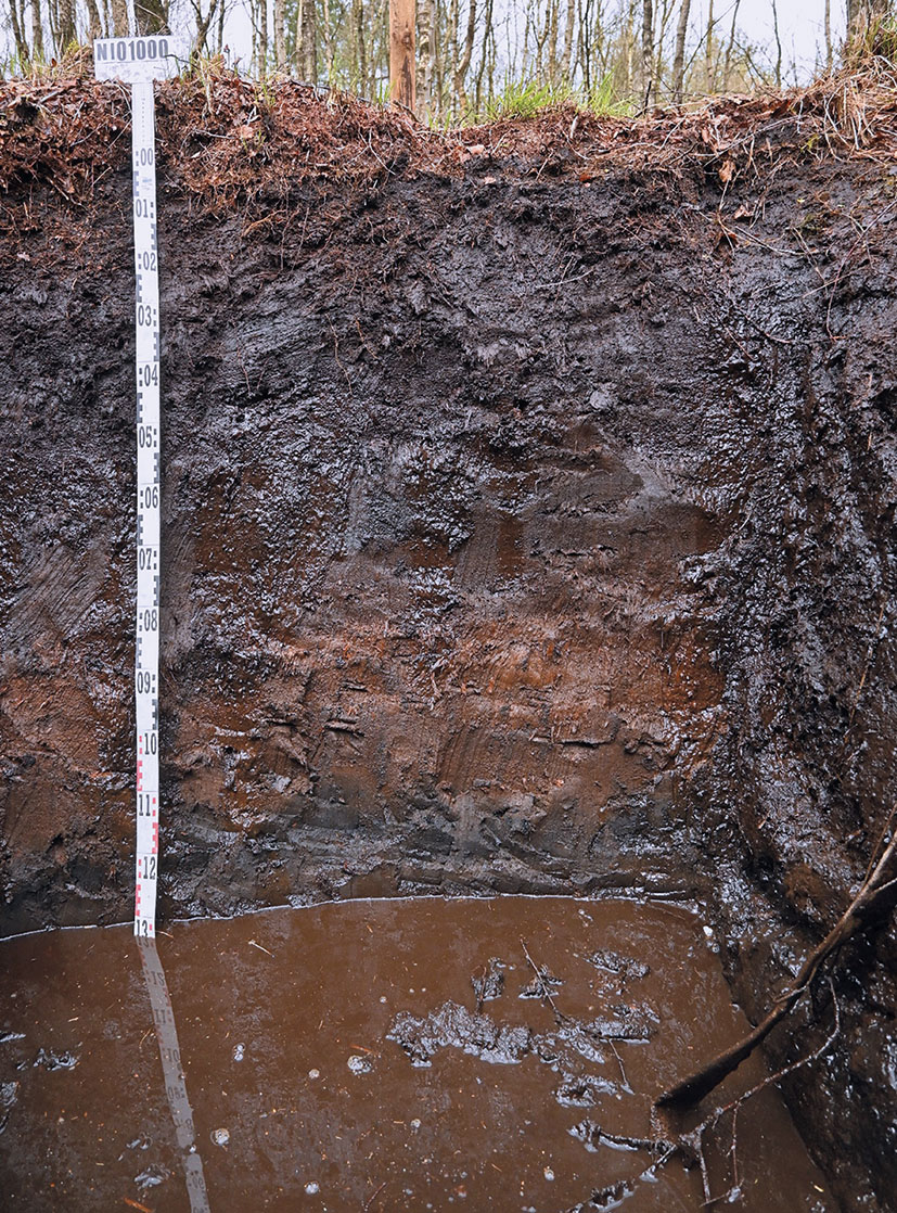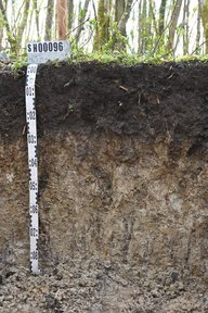 Lebewesen durchmengen und vermischen (Bioturbation, z.B. durch Regenwürmer) ebenso wie die Baumwurzeln das organisches Material und verlagern es in tiefere Bodenschichten. Dies geschieht vorwiegend im Oberboden. In tieferen Bodenschichten nehmen die Humusanteile und damit die Kohlenstoffgehalte deutlich ab, wodurch dort auch die Kohlenstoffvorräte zurückgehen. Im Oberboden bis 30 cm Bodentiefe mit Auflagehumus befinden sich bezogen auf 90 cm Bodentiefe rund drei Viertel des Kohlenstoffvorrats.