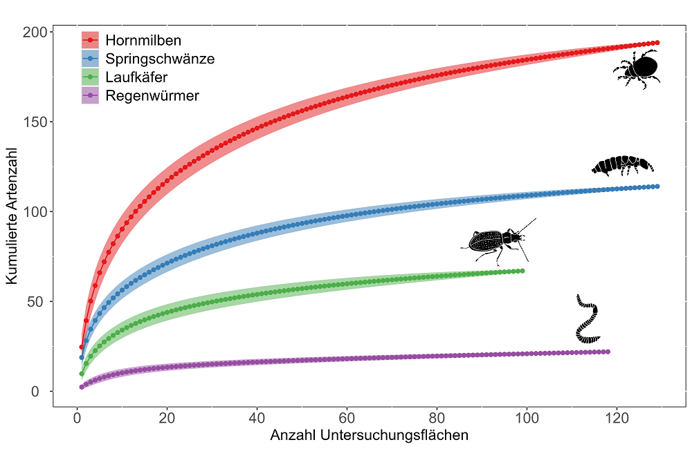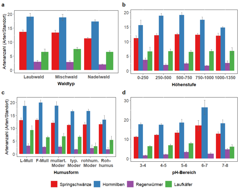 Insgesamt unterschied sich die Vielfalt der untersuchten Bodentierarten nur geringfügig über die Standorte hinweg. Laub- und Mischwälder wiesen etwas höhere Artenzahlen auf als Nadelwälder. Vermutlich eine Folge der niedrigeren pH-Werte dort. Die Artenzahlen nahmen moderat von Mull- über Moderhumusformen hin zu Rohhumus ab. Ein möglicher Hinweis auf die Verteilung ökologischer Nischen.