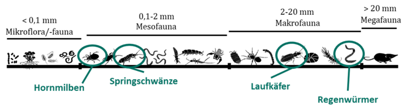 - Mikrofauna (< 0,1 mm): Fadenwürmer, Protozoen u.a.