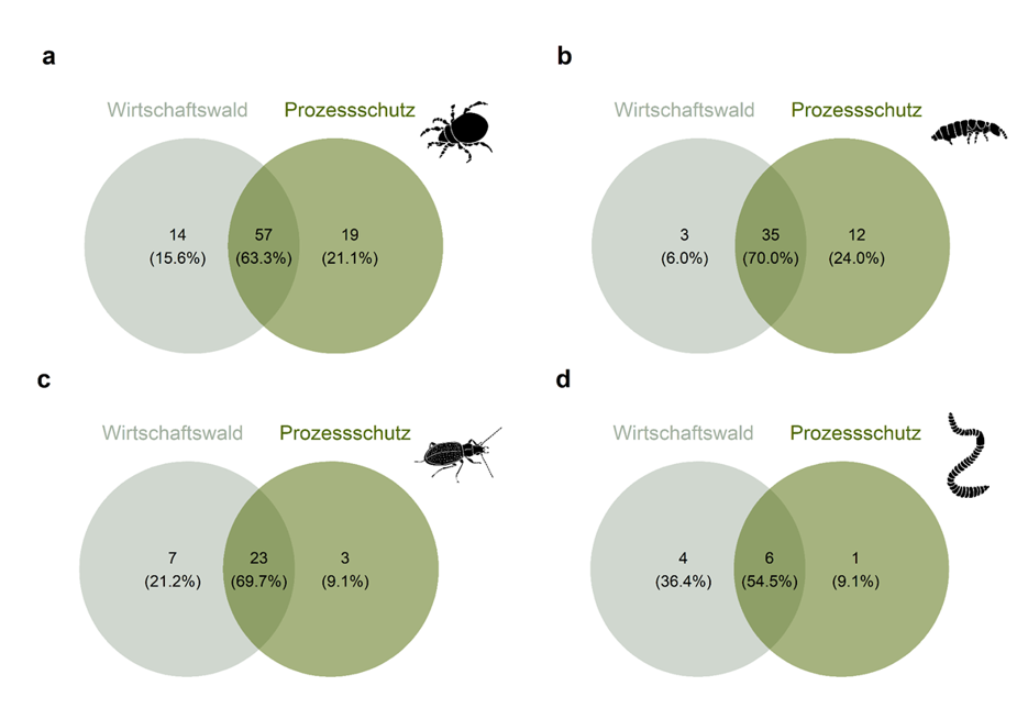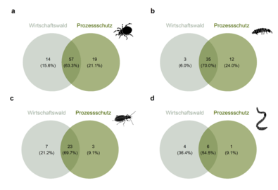Die durchschnittliche Artenanzahl von Laufkäfern war hingegen auf stillgelegten Flächen um ein Viertel niedriger als in den benachbarten Wirtschaftswäldern. Auch die Gesamtanzahl gefundener Laufkäferarten war mit 30 im Vergleich zu 26 dort etwas höher. Ursächlich könnten die weniger dichte Kronenstruktur und der höhere Anteil an Wegen und Rückegassen im Wirtschaftswald sein. Diese begünstigen das Vorkommen offenlandpräferierender Arten. Bei den zusätzlichen Arten handelt es sich jedoch nicht um spezialisierte Gruppen, sondern Generalisten. Diese Beobachtung wurde zuvor bereits in Belgien sowie in anderen Regionen Deutschlands getätigt. Regenwürmer reagierten in keiner Weise signifikant auf Flächenstilllegungen.