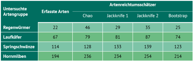 Über drei Viertel der Arten gehörten zu den Mesofaunagruppen Hornmilben (49%) und Springschwänze (29%). Die ökologisch bedeutsame Gruppe der Regenwürmer kam auf weniger als sechs Prozent. Laufkäfer nahmen mit 17 Prozent eine Zwischenstellung ein.