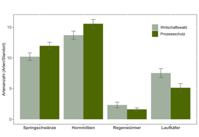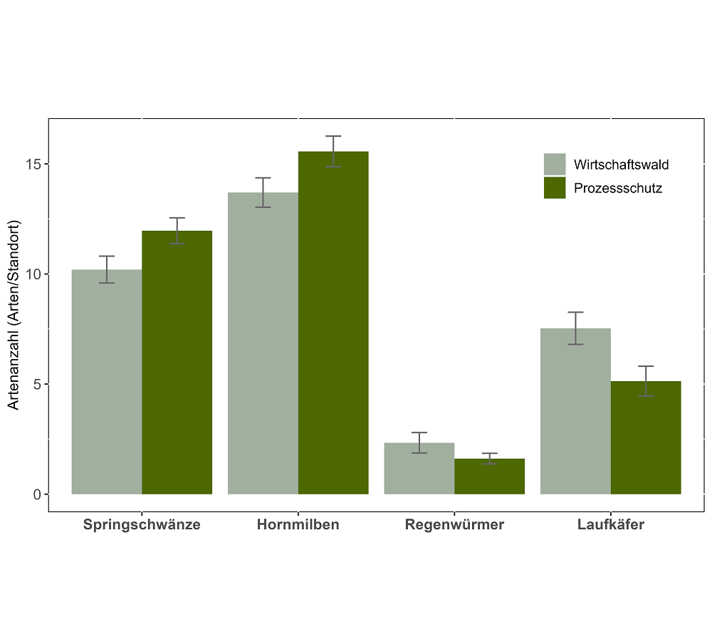 Die vorliegenden Daten zeigten hinsichtlich Besiedelungsdichte keine Unterschiede zwischen bewirtschafteten und unbewirtschafteten Wäldern. Naturnah bewirtschaftete Wälder wiesen allerdings pro Untersuchungsfläche durchschnittlich zwei Springschwanzarten weniger auf als Prozessschutzflächen (insgesamt 10 zu 12). Ein ähnliches Muster ergab sich für Hornmilben. Die erhöhte Artenvielfalt der beiden Mesofaunagruppen könnte die Folge einer höheren Habitatheterogenität unbewirtschafteter Wälder sein.