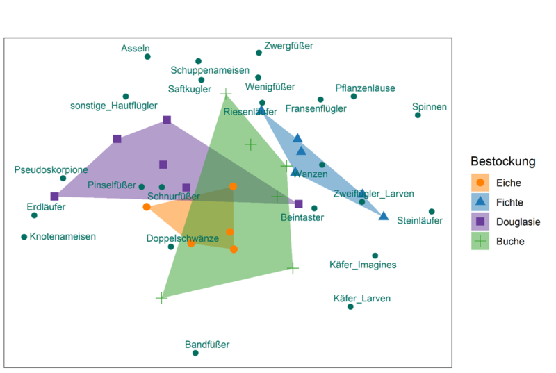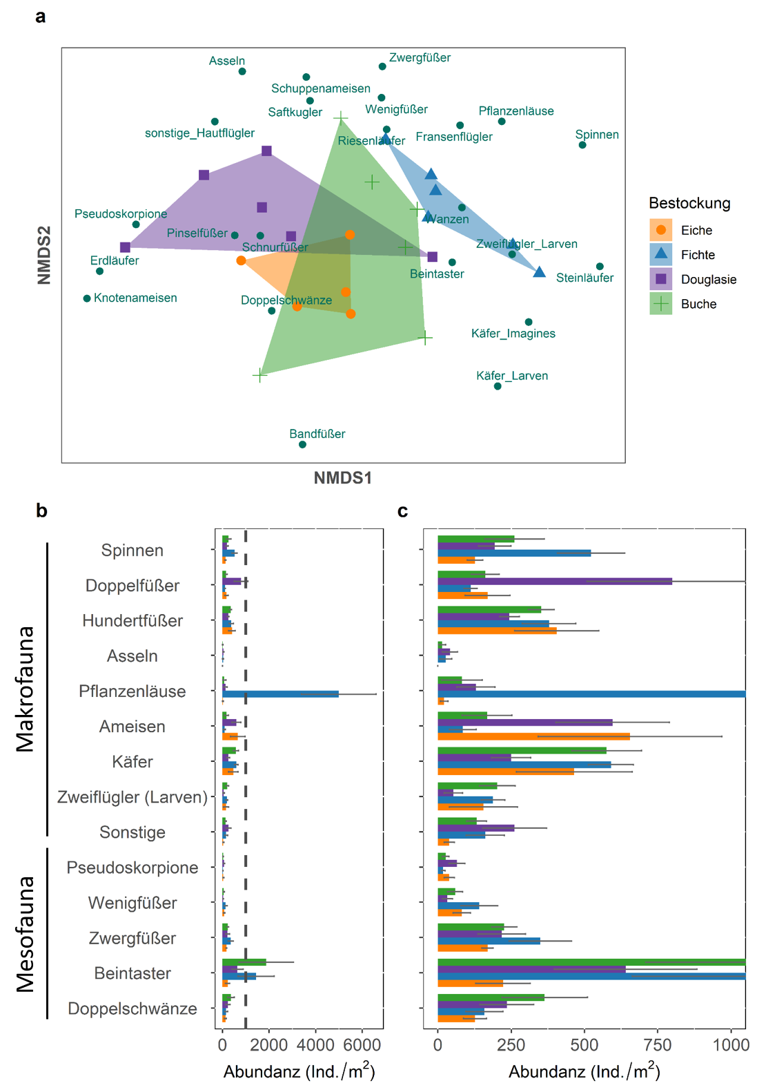 Die Zusammensetzung der Makro- und Mesofauna unterschied sich signifikant nach Baumarten. Die größte Differenz zeigte sich zwischen Fichte und Douglasie. Besonders fiel die hohe Dichte von Pflanzenläusen in Fichtenwaldböden auf. Sie war mehr als 230-fach so hoch wie in Eichen-, 60-fach höher wie in Buchen- und 38-fach höher als in Douglasienwäldern. Verglichen zu Wäldern anderer Baumarten kamen mehr als doppelt so viele Spinnen in Fichtenwäldern vor. Möglicherweise profitieren sie von der dortigen Blattlausdichte.