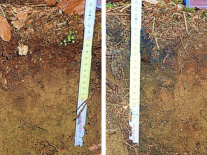Abb. 3: Bodenprofile aus zwei benachbarten Fichtenbeständen. Links ungekalkte Fläche, rechts mehrfach mit Dolomit und Dolomit-Holzasche-Gemisch behandelte Fläche.