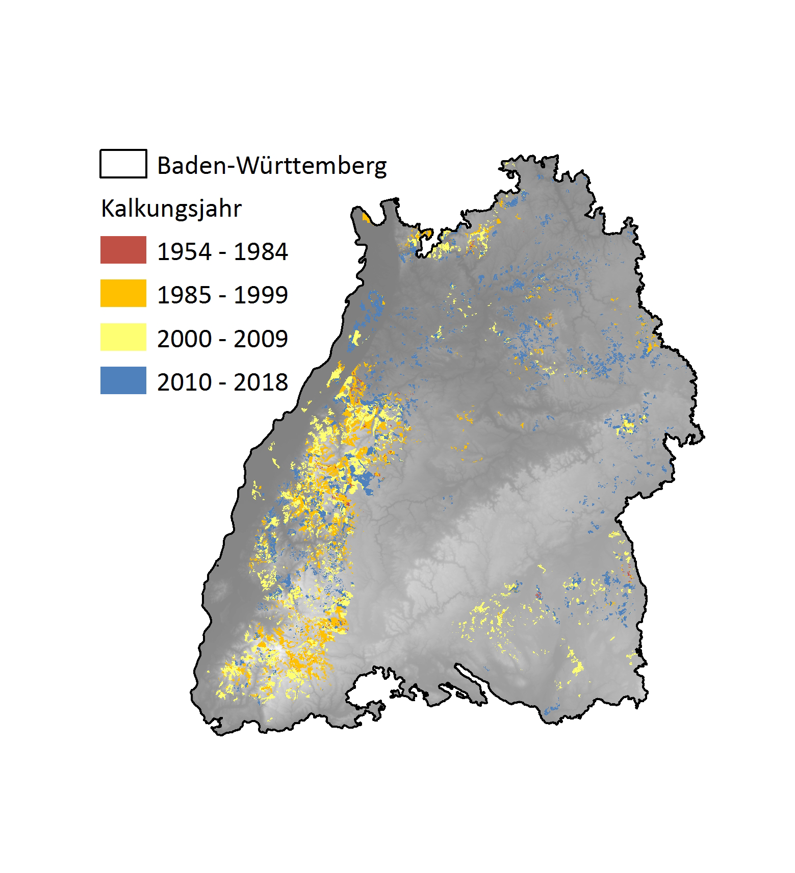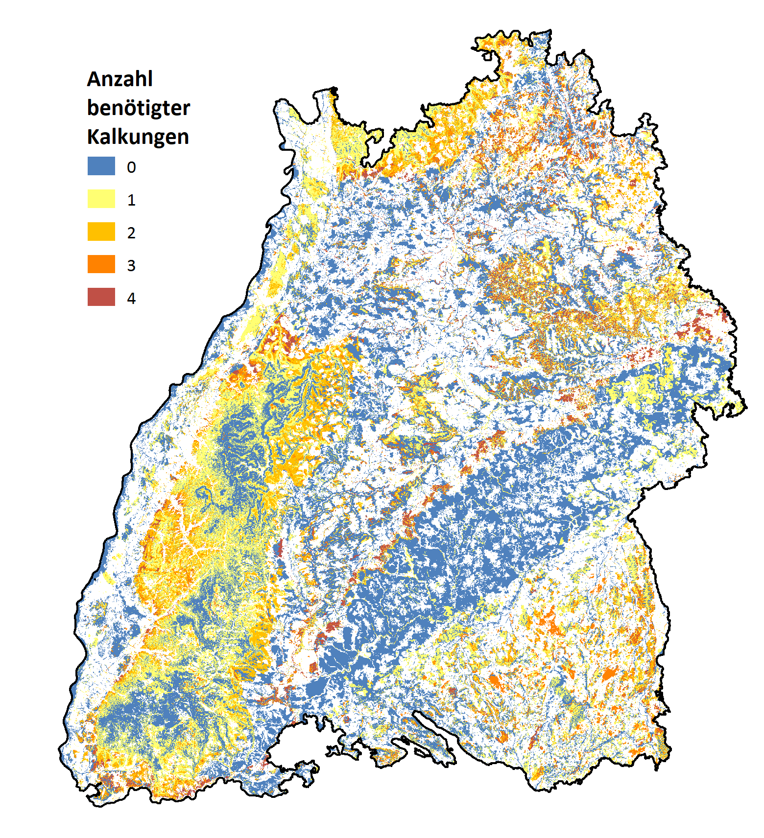 Die Grundlage für die Bewertung des Kalkungsbedarfs liefern landesweite Karten, welche sogenannte „Kalkungspotentialflächen“ sowie die notwendige Anzahl von Wiederholungskalkungen ausweisen. Der Kalkungsbedarf ergibt sich dabei aus dem Vergleich zwischen aktuellem Versauerungsstatus eines Standorts und dem angestrebten, aus historischen Werten abgeleiteten natürlichen Bodenzustand. In die Karten fließen hochaufgelöste Regionalisierungsmodelle umfangreicher chemischer und physikalischer Analysen der Bodenzustandserhebung sowie weitere wichtige Standortsinformationen (z. B. Forstliche Standortskartierung) ein. Im Zuge der konkreten Maßnahmenplanung werden auf den Potentialflächen Bodenproben gewonnen, um die Kartengrundlage zu überprüfen. Auf Flächen mit validiertem Kalkungsbedarf werden von den zuständigen Forstverwaltungen dann die Kalkungsmaßnahmen konkret geplant.