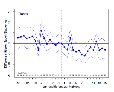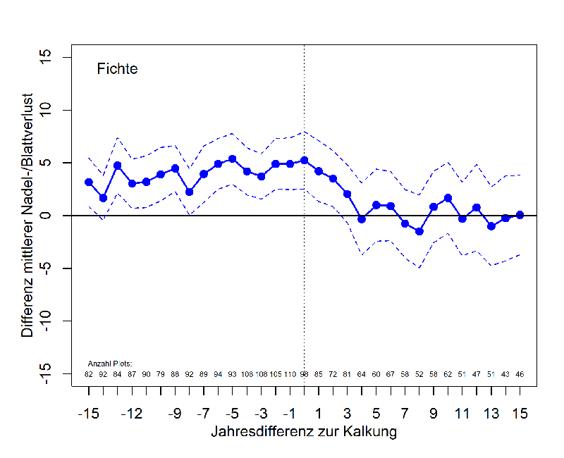 Auf gekalkten Flächen steigen der pH-Wert, die Basensättigung und die Säureneutralisationskapazität der Böden. Im Gegenzug sinken die Konzentrationen von Aluminium und Schwermetallen in der Bodenlösung und in der Humusauflage. Die Nährstoffgehalte im Kalkmittel sowie die durch den Humusabbau freiwerdenden Nährstoffreserven verbessern die Versorgung insbesondere mit Magnesium und Calcium. Infolge der positiven Wirkungen auf den Bodenchemismus und das Bodenwasser zeigen Waldbäume nach Kalkungen geschädigter Standorte häufig eine verbesserte Vitalität und oft auch ein stärkeres Wachstum. Die Aufnahmen der Kronenverlichtung im Rahmen der jährlichen Waldzustandserhebung in Baden-Württemberg belegen, dass die Nadel-/Blattverluste nach Kalkungen zurückgehen und auch 15 Jahre nach der Kalkung auf einem niedrigeren Niveau bleiben als auf ungekalkten Standorten (vgl. Abb. 2). Eine temporäre Nährstoffanreicherung im Oberboden kann jedoch zunächst zur Verflachung des Feinwurzelsystems führen. Mit zunehmender Kalkungswirkung in die Tiefe folgt, insbesondere auf sehr stark geschädigten Standorten, aber auch eine tiefere (Wieder-)Erschließung des Wurzelraums.