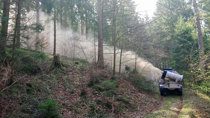 Die Ausbringung erfolgt zwischen Anfang Juli und Ende Oktober entweder durch Verblasung von Fahrwegen und Rückegassen aus oder mittels Helikopter. Aufgrund der geringeren Kosten und des niedrigeren Energiebedarfs wird die terrestrische Ausbringung in Baden-Württemberg favorisiert. Dass dennoch etwa drei Viertel der Flächen per Helikopter gekalkt werden, liegt vor allem an der weniger aufwändigen Planung und an teils schwer erschließbaren Waldbeständen. Zukünftig soll die Beratung zum Einsatz von Gebläsetechnik verstärkt werden, um deren Akzeptanz in der Praxis zu erhöhen.