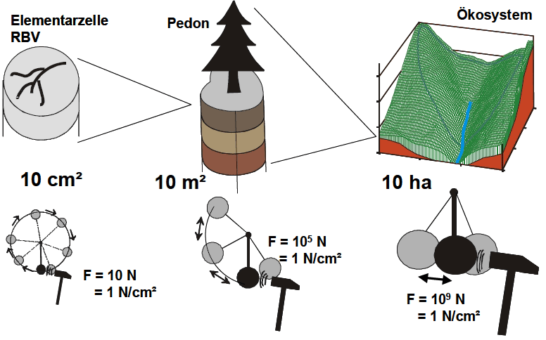 Im Analogbeispiel ist dies durch die "Perforation" des Pendels symbolisiert. Dadurch wird die Masse des Pendels reduziert, bis sie sich im Extremfall proportional zur äußeren Oberfläche verhält. Letzteres würde gleichbedeutend mit dem vollständigen Verlust der systemaren Regeleigenschaften sein. Das Pendel wird nach der Krafteinwirkung ähnlich chaotisch und nicht prognostizierbar ausschlagen wie auf der Ebene des RBV. Auf Ökosystemebene gilt das Gleiche. Ein Verlust von Regeleigenschaften auf Ökosystemebene würde sich in der Realität z.B. darin äußern, dass der Systemoutput (z.B. Menge und chemische Zusammensetzung des Gebietsabflusses) nicht mehr gedämpft und gleichmäßig ist, sondern in Abhängigkeit von der Variabilität des Inputs (z.B. des Niederschlags) schwankt. Das bedeutet, das System puffert nicht mehr.