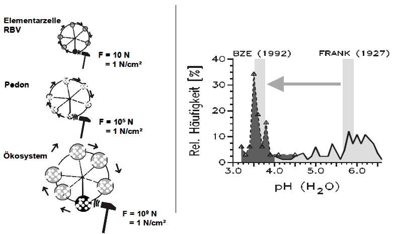 Auf silikatischen und tief entkalkten Böden im Bereich von Schwarzwald und Odenwald hat die Säurestärke im Oberboden um 1,5-2 pH-Stufen zwischen Mitte der 20er und Anfang der 90er Jahre zugenommen. In Abb. 2 ist diese Entwicklung am Beispiel der pH – Veränderung in Oberböden auf Bunsandsteinstandorten gezeigt. Durch diese anthropogen verursachte Bodenversauerung werden Intensität und Relation pedogenetischer und bodenökologischer Leitprozesse teilweise schwellenartig verschoben. Durch die enge Prozesskoppelung zwischen bodenchemischen, bodenphysikalischen und bodenbiologischen Eigenschaften von Böden bewirkt eine solch drastische Verschlechterung des bodenchemischen Milieus in für die natürliche Bodenentwicklung extrem kurzer Zeit als integrale Beeinträchtigung von Filter- und Puffereigenschaften sowie der Lebensraumfunktion von Böden. In Rückblende zu unserem physikalischen Gedankenmodell (Abb. 1) ist dieser Aspekt in Abb. 2 (links) schematisiert. Auf der Ebene des repräsentativen Bodenvolumens (RBV) besteht ähnliche Unsicherheit in der Prognose von System - Entwicklungen wie im ungestörten Zustand. Auf der mesoskaligen Ebene des Pedons wird durch diese "Erosion wesentlicher Systemeigenschaften" (z.B. Aufbrauchen von Puffersubstanzen und deren Wegfuhr mit dem Bodenwasser in Form von Neutralsalzen) eine ähnliche Sensitivität wie auf der Mikroebene verursacht.