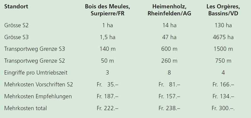 Die jährlichen Mehrkosten in der S2 bewegen sich in den Fallbeispielen zwischen Fr. 222.– und Fr. 300.–/ha. Sie treffen die Waldbesitzer mit ausgedehnten Schutzzonen – bedingt durch die Einschränkungen auf einer viel grösseren Fläche – jedoch ungleich härter. Zudem entfallen etwa im waadtländischen Bassins Fr. 166.– oder gut 55% des gesamten Mehraufwands auf die verbindlichen Vorschriften, während es in Rheinfelden Fr. 81.– und in Surpierre mit der kleinsten S2 nur Fr. 35.– sind.