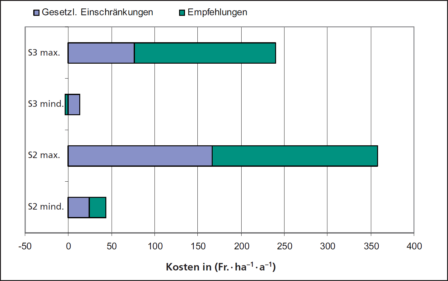 Rechnet man die aus den Vorschriften und Empfehlungen resultierenden Mehrkosten – beziehungsweise Mindererträge – zusammen, so beläuft sich der theoretisch kalkulierte Zusatzaufwand für den Schutz der Trinkwasserressource in der S3 auf Fr. 9.– bis Fr. 240.–/ha und Jahr, während der Betrag in der S2 zwischen Fr. 43.– und Fr. 358.– schwankt (Abb. 3).