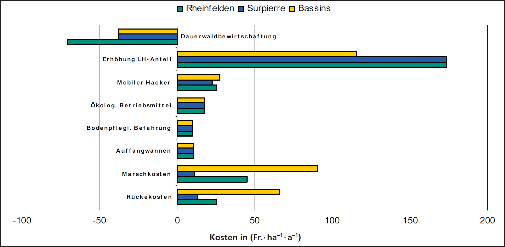 Wichtigste Einflussfaktoren für die grosse Spannweite dieser minimalen und maximalen Werte sind das Ausmass der Erhöhung des Laubholzanteils, die Intensität der Waldbewirtschaftung, unterschiedliche Rückedistanzen, die sich aus der Grösse der Schutzzonen ergeben, sowie die damit verbundenen zusätzlichen Wegstrecken für das Auftanken der Motorsägen.