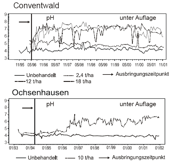 Abb. 1: pH-Wert in der Bodenlösung unter der Auflage für die Fichtenversuchsflächen im Conventwald (oben) nach Ausbringung von 2.4 t/ha, 12 t/ha und 18 t/ha Holzasche sowie für Ochsenhausen (Ascheausbringung von 10 t/ha).