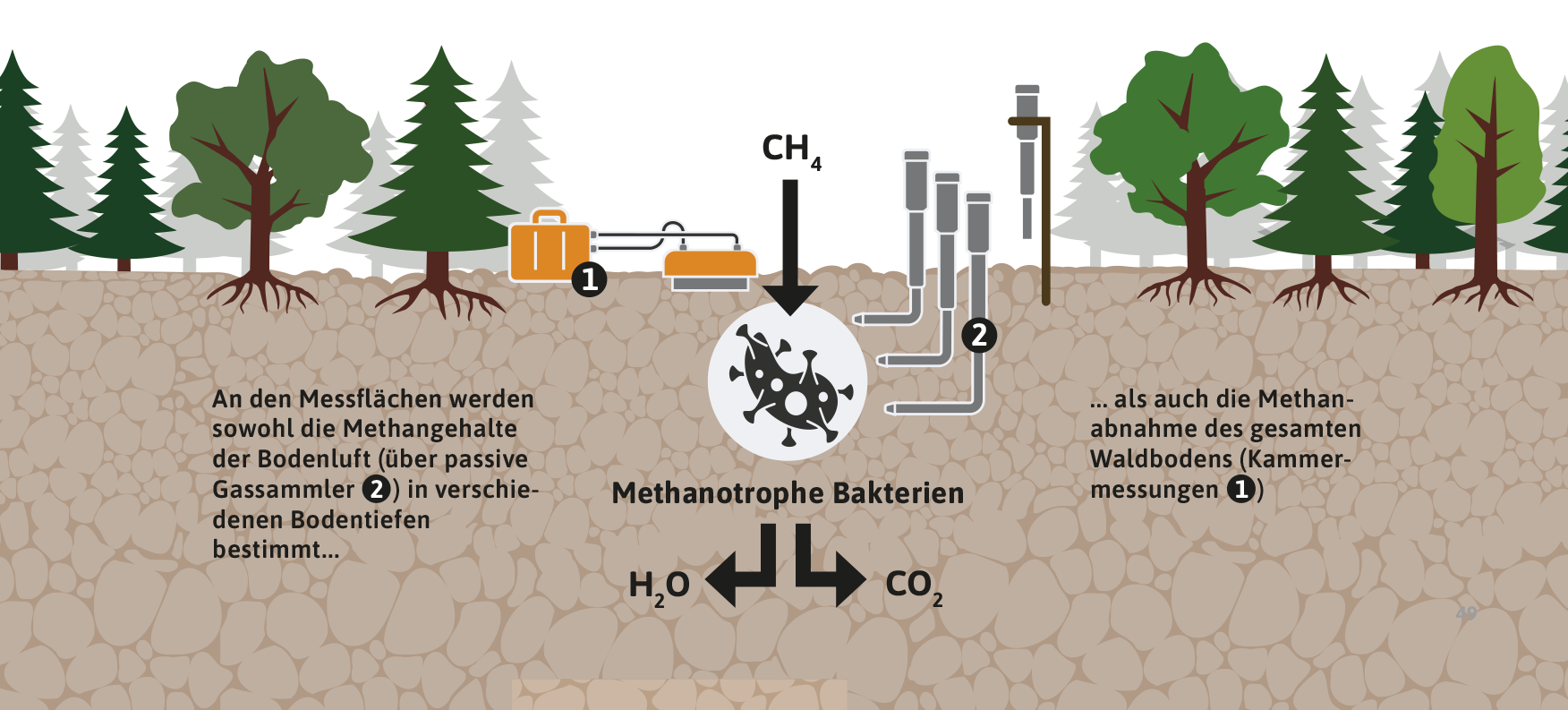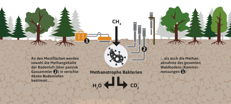 Treibhausgasflüsse aus Böden werden in den meisten Fällen über sogenannte Kammermessungen bestimmt: Dabei wird eine Haube auf den Waldboden aufgesetzt und die Menge an Methan, die von Bakterien im Waldboden veratmet wird, führt während der Messung dann zu einem Konzentrationsabfall in der Messhaube. Das Veratmen des Methans kann dabei in Echtzeit beobachtet werden. In aktivem, unverdichtetem Waldboden wird viel Methan abgebaut.