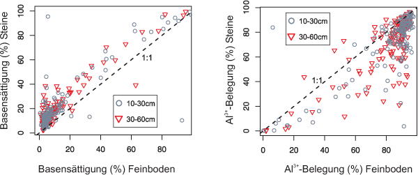 Die Steine sind somit als Quelle basischer Kationen identifiziert. Dem entgegen läuft die Versauerung, die im Feinboden stärker ausgeprägt ist als in der Gesteinsfraktion. Zu betonen gilt es hierbei, dass schwach versauerte Feinböden auch im Gesteinsanteil geringe Versauerungsintensitäten aufweisen. Bei stark versauerten und nährstoffverarmten Standorten hingegen ist auch der Anteil basischer Kationen in den Steinen deutlich reduziert. Es wird jedoch eine "eiserne Reserve" an basischen Kationen in den Steinen nicht unterschritten. Eine etwa 5 bis 10 % höhere Basensättigung weisen auch die basenärmsten Böden auf.