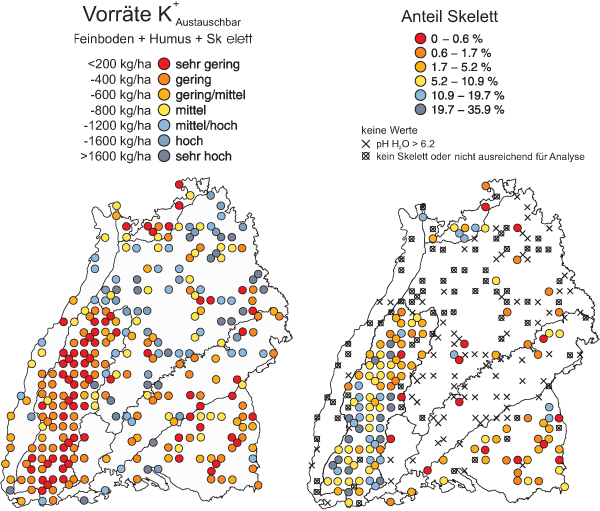 Abb. 3: Beispiel eines basischen Pflanzennährstoffs: Summe der Vorräte an pflanzenverfügbarem Kalium in Feinboden, Humusauflage und Skelett (links) sowie der prozentuale Anteil der Steine an der Gesamtversorgung (rechts).