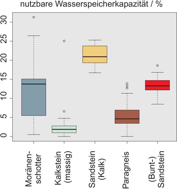 Abb. 5: Nutzbare Wasserspeicherkapazitäten der untersuchten Gesteine.