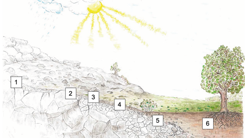- Bodenbildungsprozesse wandeln das Gestein mehr und mehr zu lockerer Erde um, in der schliesslich Sträucher und Bäume wurzeln und überleben können.